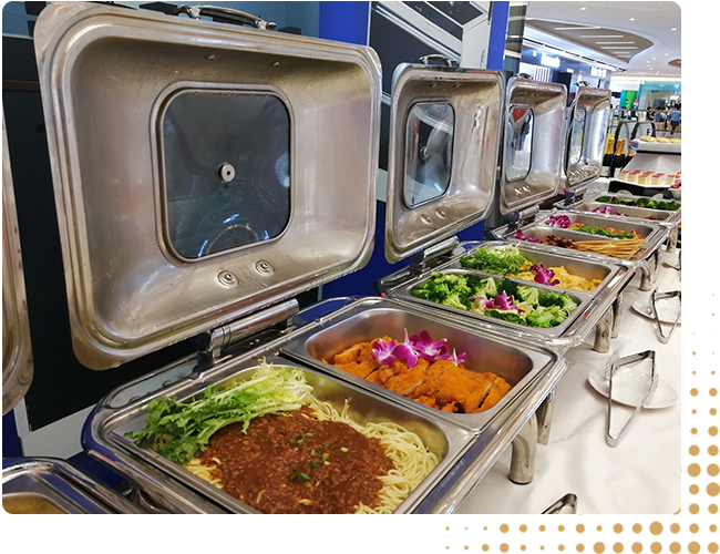 目前国际上所通行的一种非正式的中/西式宴会,西式自助餐宴会通常菜品包括(头盘,沙拉,面包,汤,热菜,甜品,水果,饮料等等)在大型商务活动中尤为多见,主要特点是在用餐时调动用餐者的主观能动性,在既定的范围之内安排选用菜肴,注重用餐者之间的互动与交流,非常具有现场气氛。